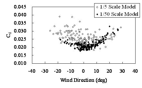 ![]() Drag coefficients of 1/5 and 1/50 scale models : siginificantly dependent on wind direction |