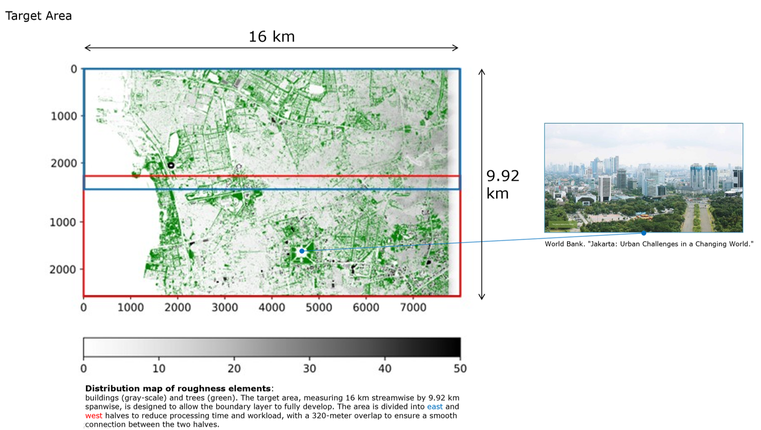 背景: 急速に発展しているジャカルタでは都市化による影響が深刻化しています。樹木が、ビル群による突風を緩和したり乱流に与える影響について明らかすることを目標としています。 方法: スーパーコンピュータ「TSUBAME4」を使用します。格子ボルツマン法(LBM)により高解像度かつ大規模なシミュレーションが可能になります。